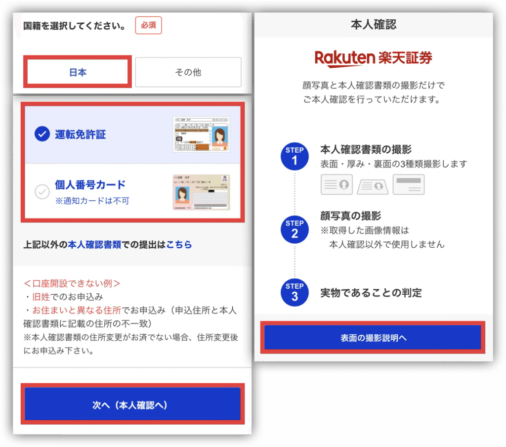 国籍を選択して、提出する本人確認書類を選んだら「次へ(本人確認へ)」をタップ。