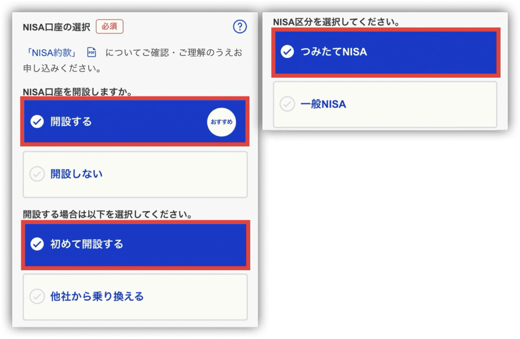 NISA口座を新しく開設する場合は、ここで「開設する」をタップして、該当する選択肢をタップしましょう。