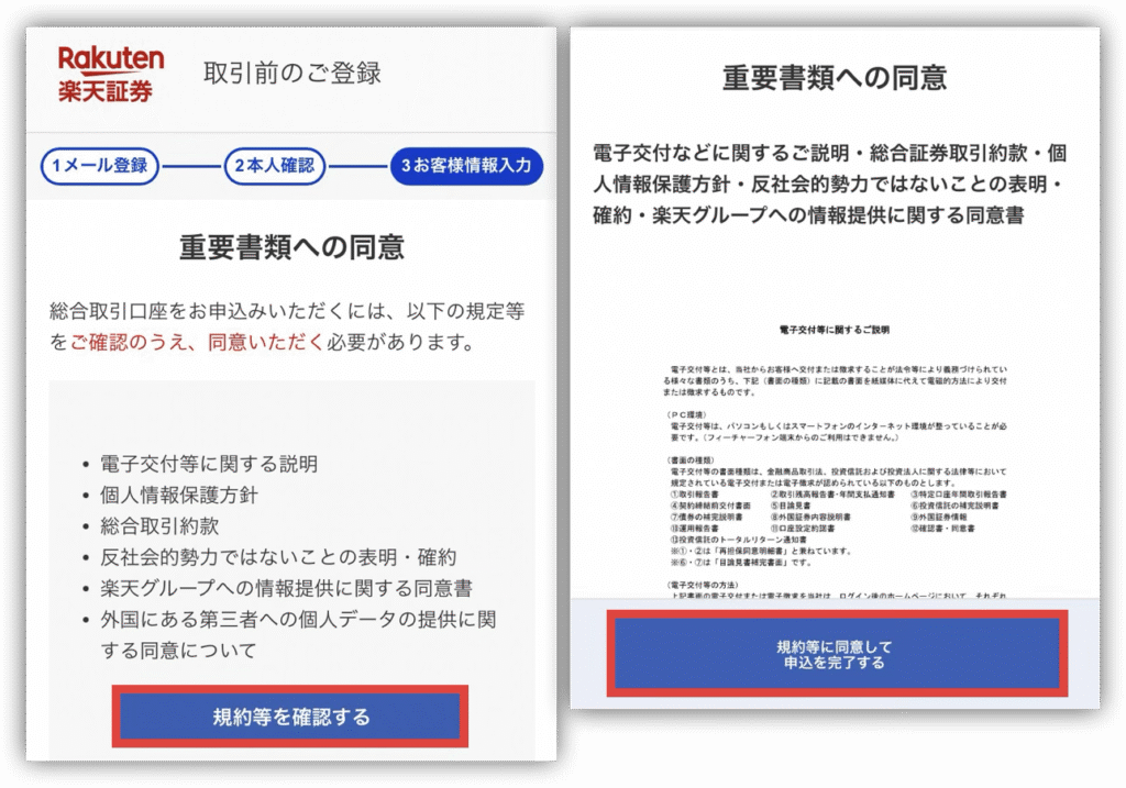 画面が変わったら「規約等を確認する」をタップして、重要書類を確認します。