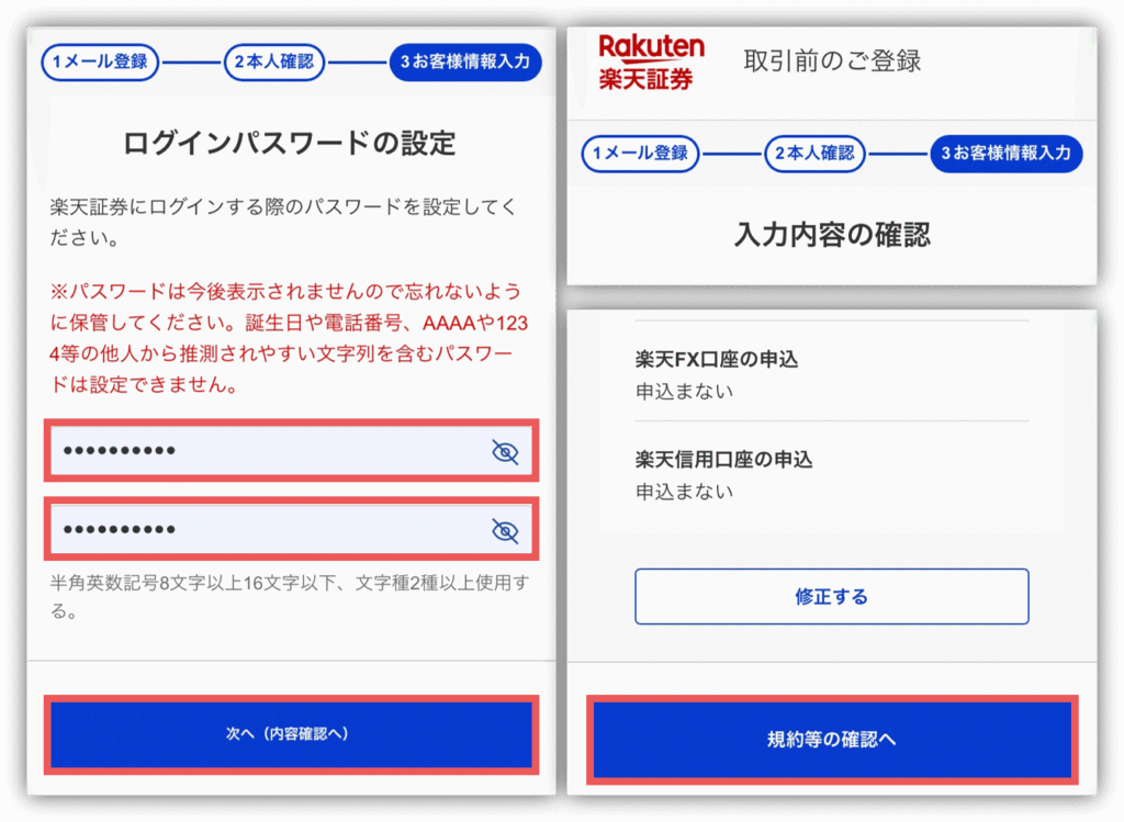 続いて、ログインパスワードを設定して、入力内容の確認をします。